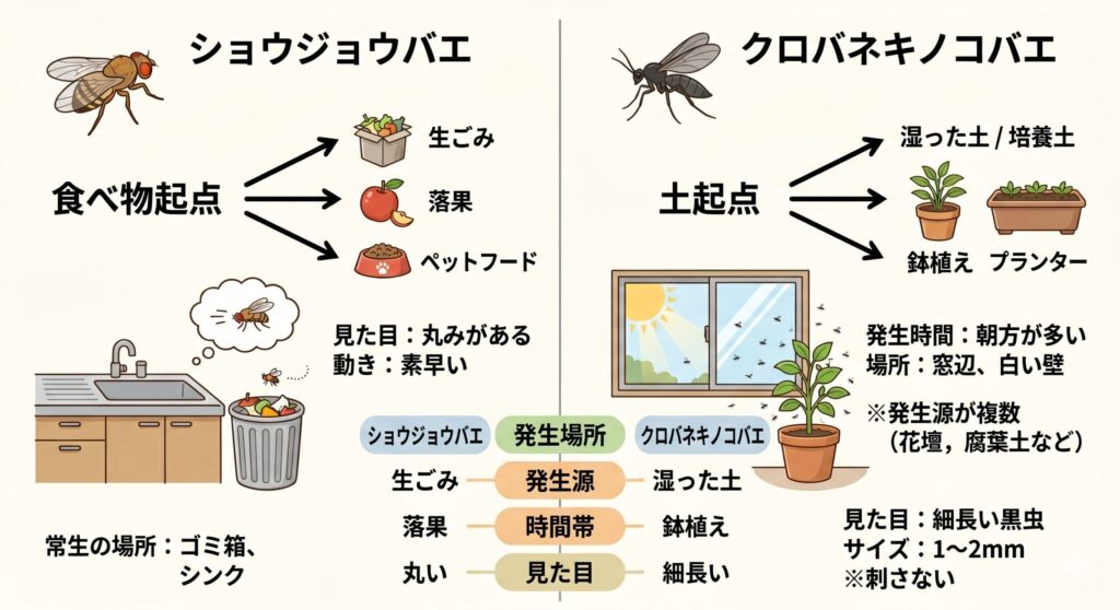 夕方に蚊柱のように群れるならユスリカ、鉢土や腐葉土の近くで黒い小虫が多いならキノコバエ、生ごみや落果の周辺ならショウジョウバエ、葉を触ると白い虫が舞うならコナジラミの可能性があります。