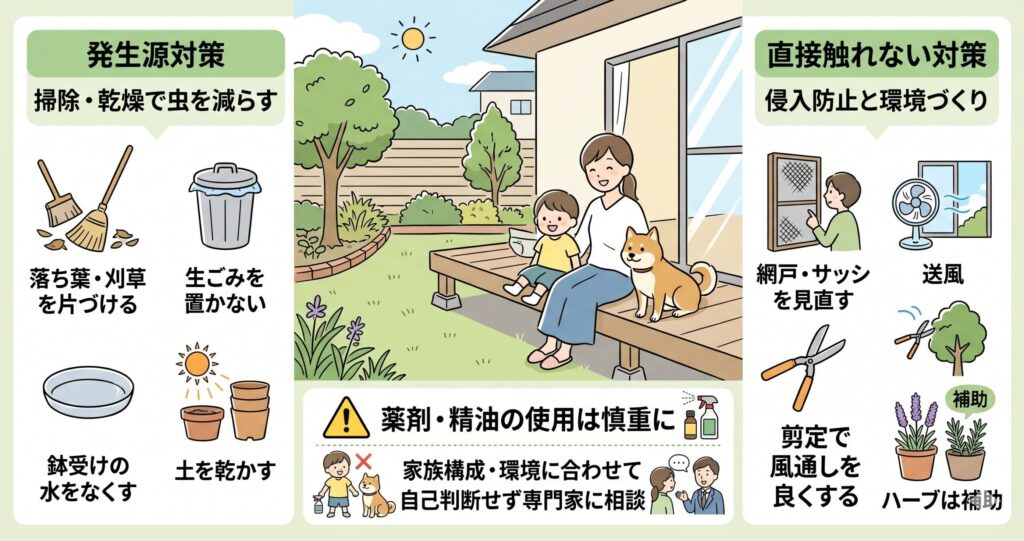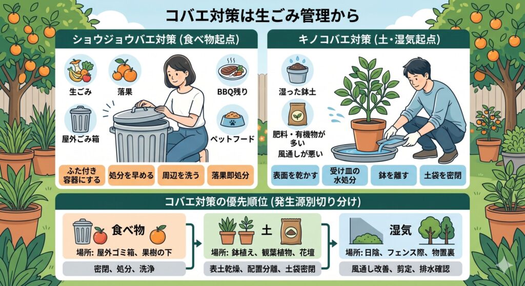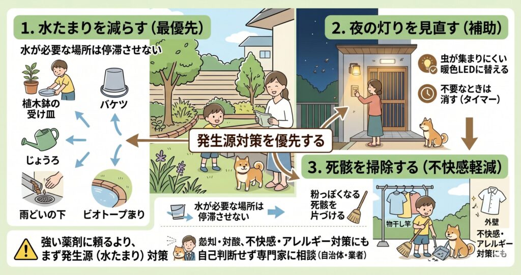 まずは水たまりをなくす、落ち葉や生ごみを片づける、腐葉土や鉢土の湿りすぎを防ぐ、夜の照明を減らすなど、
