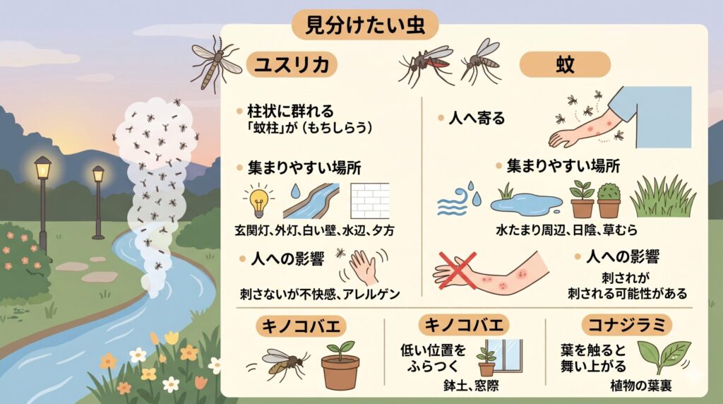 | ユスリカ | 柱状に群れる、ふわっと漂う | 水辺、玄関灯、白い壁、外灯周辺 | 吸血しないが不快感やアレルゲンに注意 |
