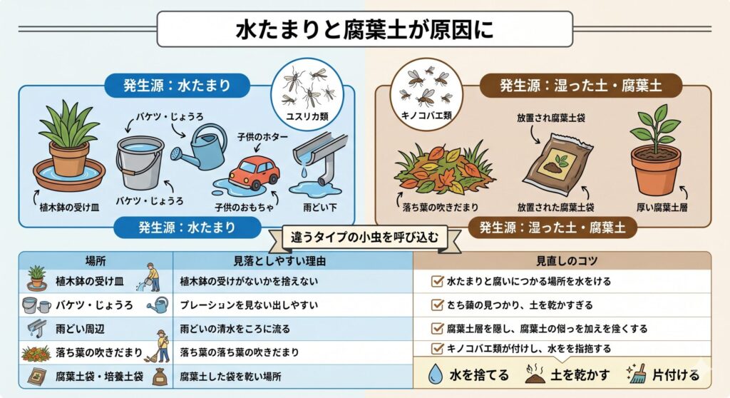 ひとつの鉢だけが原因ではなく、花壇、プランター、腐葉土袋の置きっぱなし、落ち葉が湿ってたまる場所など、