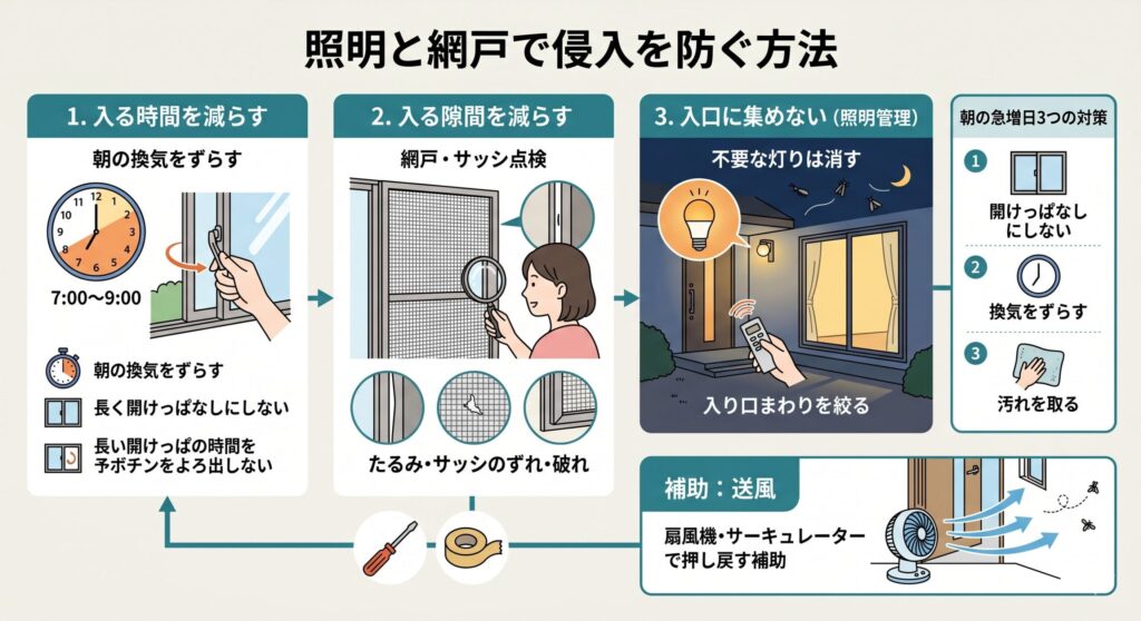 窓を開けっぱなしにしない、換気は時間をずらす、網戸まわりの汚れを取る、