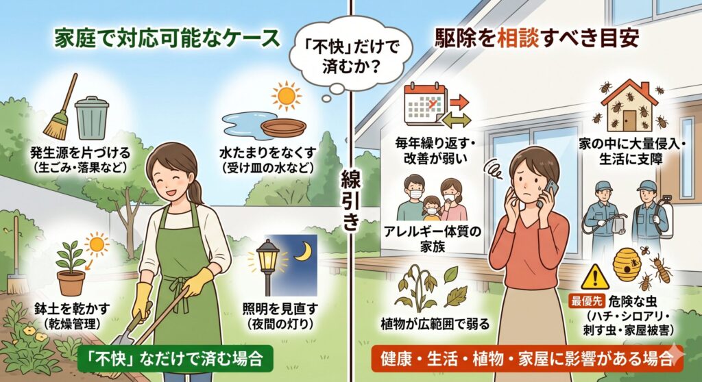 植物被害が広がる場合、家の中まで大量に入って生活に支障が出る場合は相談の目安です。ハチの巣や刺す虫、家屋被害が疑われる場合は、早めに専門家へ相談したほうが安心です。