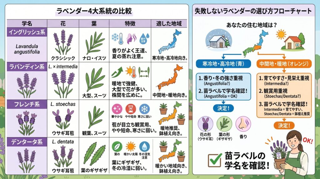 寒冷地や高冷地ならイングリッシュ系、中間地から暖地ならラバンディン系が無難です。見た目だけでフレンチ系を選ぶと、気候によっては冬越しや夏越しで苦労することがあります。