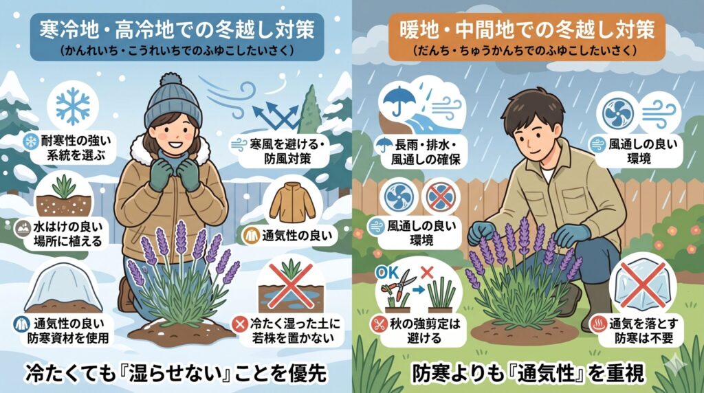 | 暖地 | 冬より春以降の蒸れ | 耐暑寄りの系統を選び、冬も乾きやすい場所に植える | 防寒優先で通気を落とすこと |