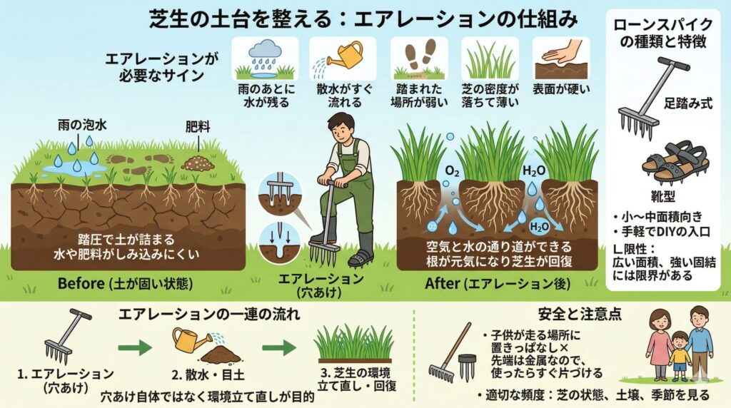 サッチが厚くなっている、水がしみにくい、土が固い、芝が薄いなどのサインがあるときに優先して検討するのがおすすめです。