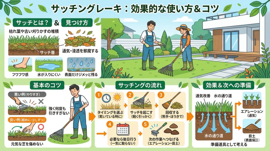 サッチ対策、通気改善、目土、施肥を足していく流れが、無理なく続けやすいかなと思います。