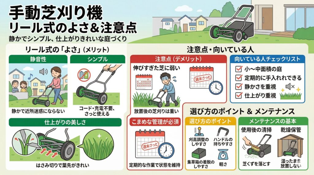 面積が小さい庭なら、静かで扱いやすい手動式でも十分に回せることがあります。