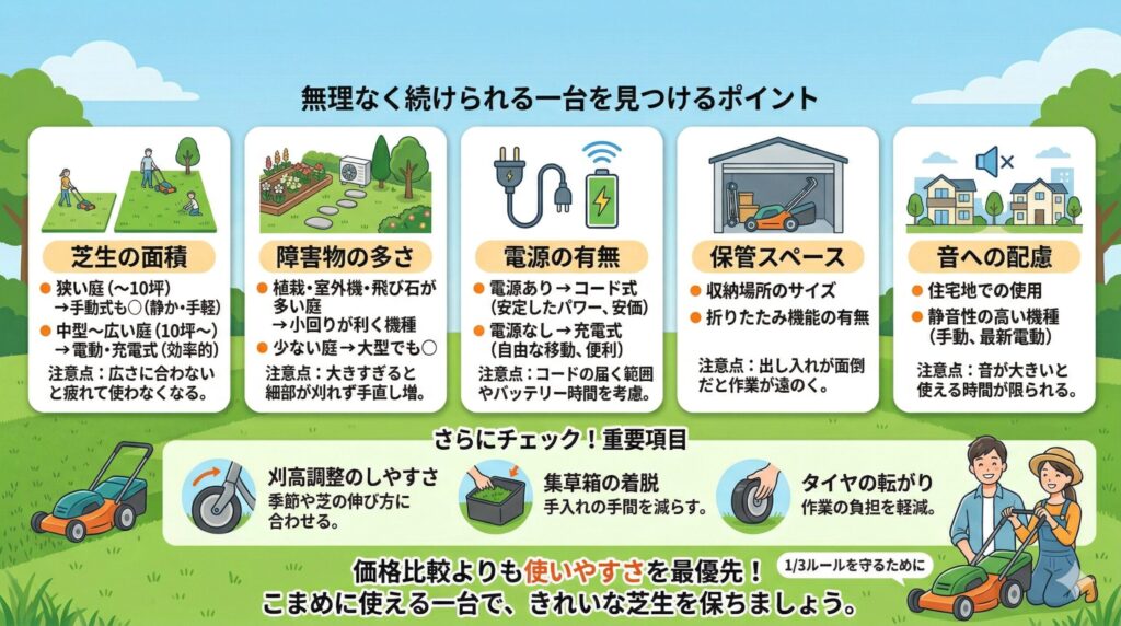 ここが合っていないと、芝刈りそのものが面倒になりやすく、