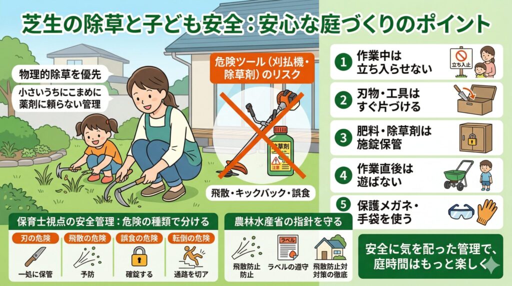 子どもが庭で遊ぶ家なら、まず物理的な除草を優先して考えるのが安心です。