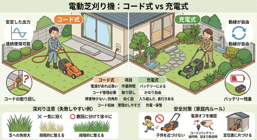 刈高を細かく変えにくい機種だと、深刈りしやすくなったり、芝が伸びたときに対応しづらくなったりします。