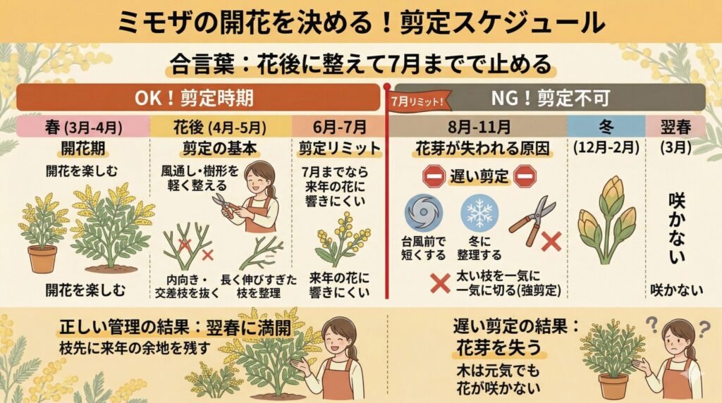 花後から七月までの剪定が基本で、夏以降は花芽形成を邪魔しないことが大切という点です。