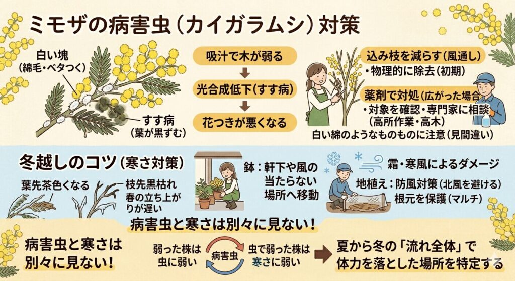 ミモザは暖かいイメージのある木なので、寒さに対して無防備になりやすいですが、花芽の時期は思っている以上に環境差が出ます。