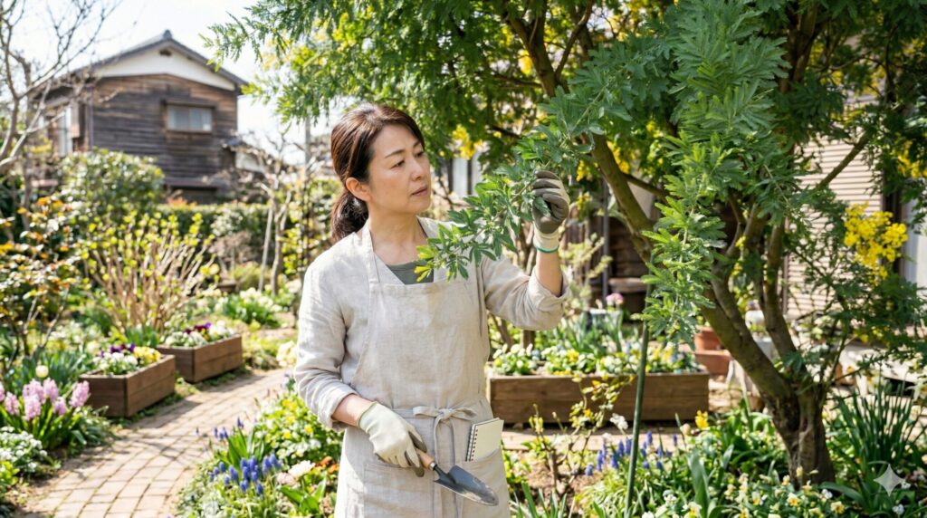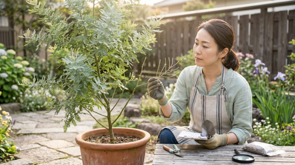 高木化したミモザの剪定、移植、薬剤防除、安全性の判断に迷う場合は、最終的な判断は専門家にご相談ください。