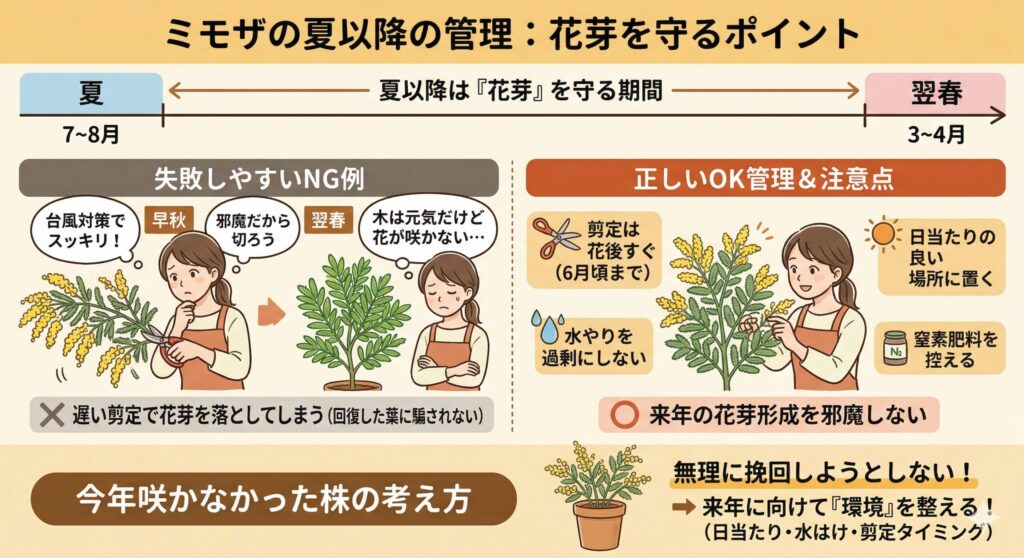 ここがズレると、枝は元気でも花だけ咲かない状態になりやすいです。