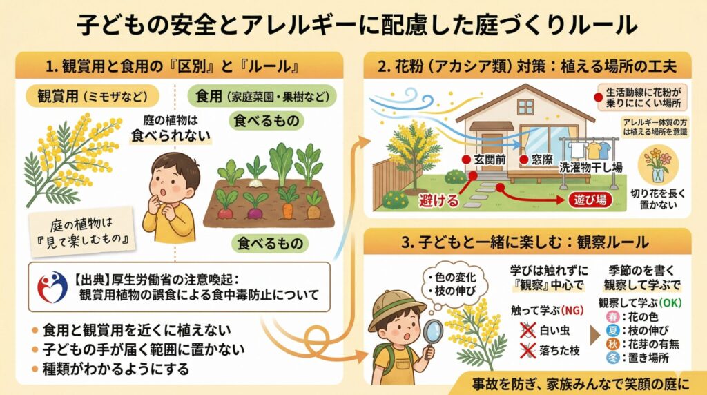 子どもがいる庭では、ミモザを育てること自体よりも、どう配置し、どうルール化するかのほうが大切です。