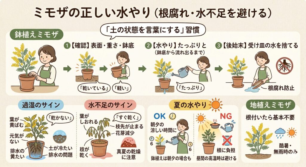 ずっと湿っていると根腐れしやすく、逆に真夏の乾燥放置も花芽形成に悪影響が出やすいので、土の乾き方を見て調整するのが大切です。