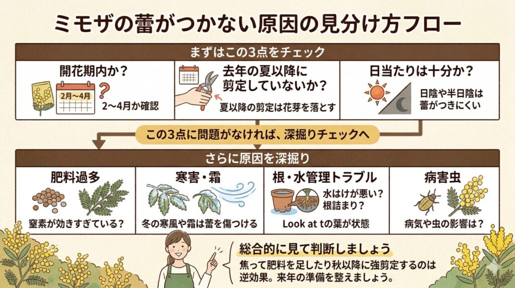 ミモザが花が咲かないのは、ただ時期が早いだけなのか異常なのか、どう見分ければいいですか?