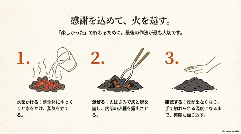 「完全消火」です。見た目が消えていても、灰の中に熾火が残っていることはよくあります。水をかけて混ぜ、手で触れて冷たい状態になるまで確認しましょう。後片付けまで含めて焚き火だと考えることが、安全と信頼につながります。