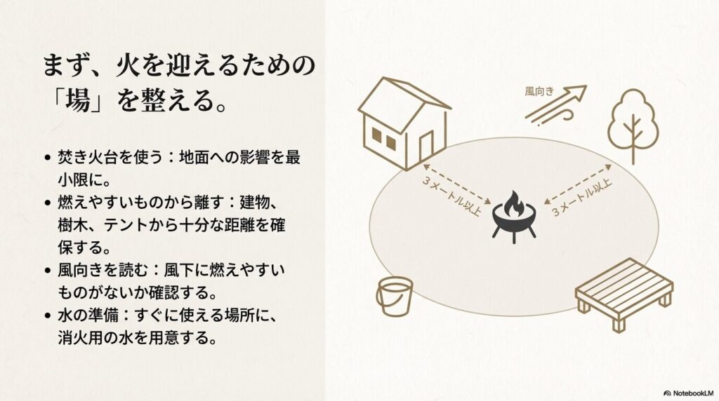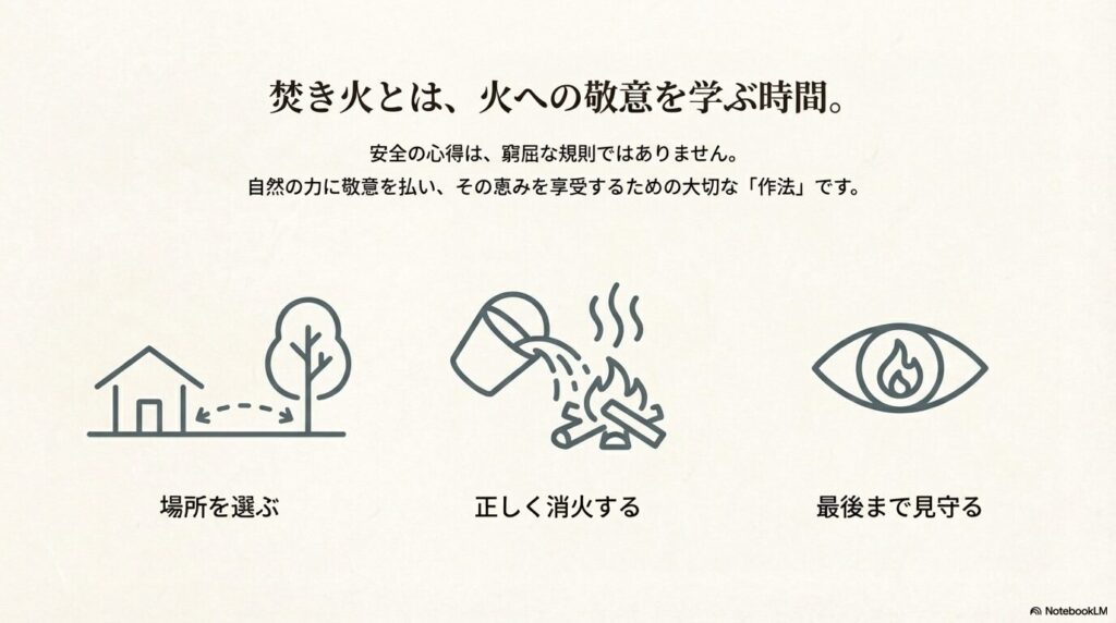 - 庭で焚き火を安全に楽しむための具体的なルールが分かる