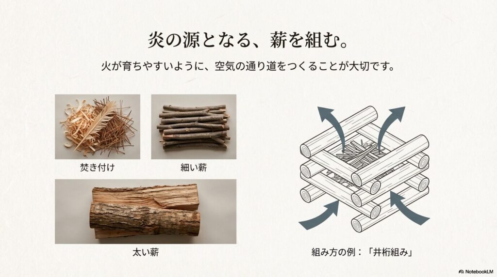 - 薪同士の間に適度なすき間を作って空気の通り道を確保する